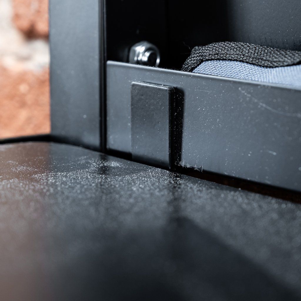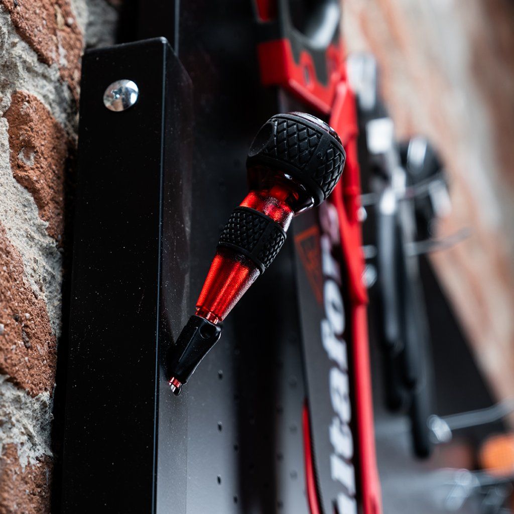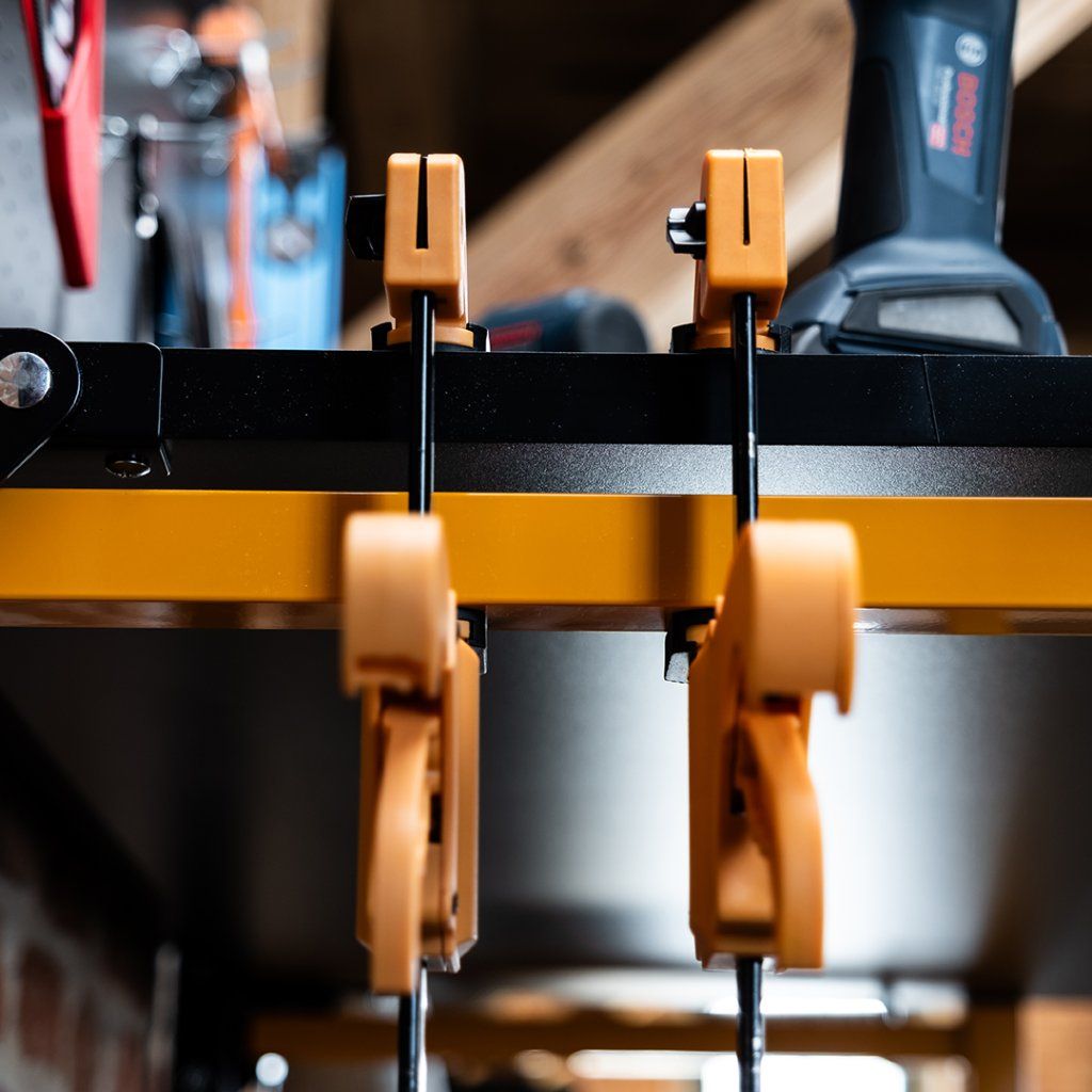 Ένα σημαντικό πλεονέκτημα αυτού του πάγκου εργασίας είναι η δυνατότητά του να αναδιπλώνεται αβίαστα ενώ παραμένει σταθερά αγκυρωμένος στον τοίχο. Όταν χρησιμοποιούνται χημικά αγκύρια για τους γάντζους τοίχου, οι πρόσθετες βίδες για τον πλευρικό σκελετό του πάγκου (οι οποίες περιλαμβάνονται) καθίστανται προαιρετικές. Επιπλέον, δεν χρειάζεται να αδειάσετε το πεγκμπόρντ. Μόνο το κάτω τμήμα του πάγκου αρθρώνεται, διατηρώντας την οργανωμένη διάταξη των εργαλείων σας.