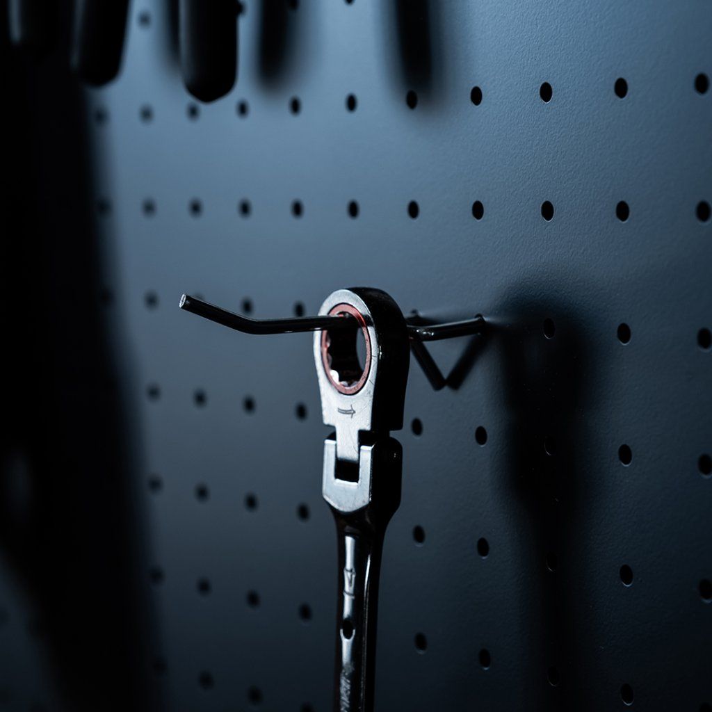 Το ενσωματωμένο πίσω πεγκμπόρντ μετατρέπει τον χώρο πίσω από τον πάγκο σε έναν εξαιρετικά λειτουργικό οργανωτή. Εξοπλισμένο με γάντζους, ράγες και θήκες, επιτρέπει την εύκολη και συστηματική τακτοποίηση διαφόρων εργαλείων και αξεσουάρ, διασφαλίζοντας ότι είναι πάντα προσβάσιμα και τακτοποιημένα αποθηκευμένα. Αυτό παρέχει άφθονο χώρο για βασικά εργαλεία, μικρά εξαρτήματα και άλλες ανάγκες του συνεργείου.